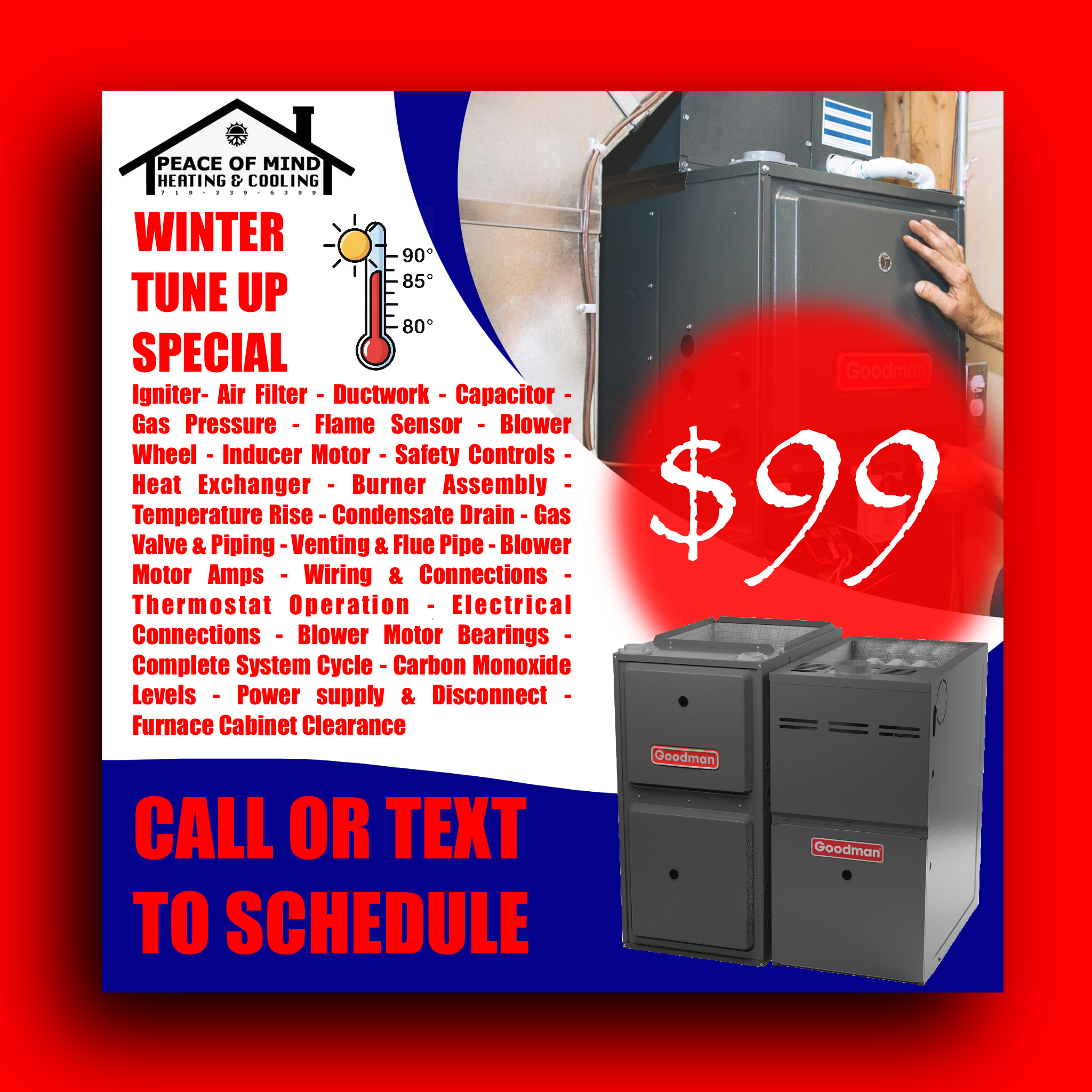 Our Winter Tune-Up Special ensures your high-efficiency or standard furnace runs safely, efficiently, and affordably:
